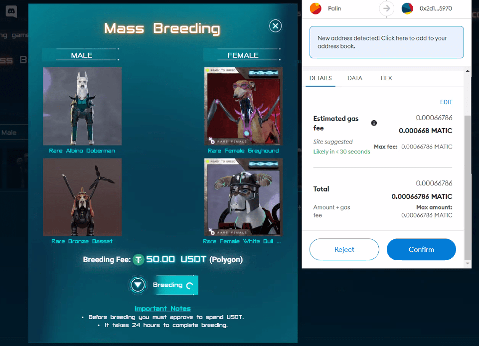 3. Fees is 25 $USDT per pair, click on “breed now” and confirm the metamask transaction.